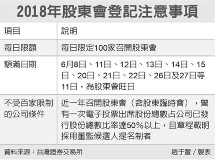 證交所指出,根據召開股東常會日期事前登記作業規範,今年可不受股東會每日召開100家限制者,僅限於近一年召開股東會(含股東臨時會),曾有一次電子投票出席股份總數占公司已發行股份總數比率達50%以上,且章程載明採用董監候選人提名制的公司,其餘遇登記日期額滿,系統均無法進行候補。